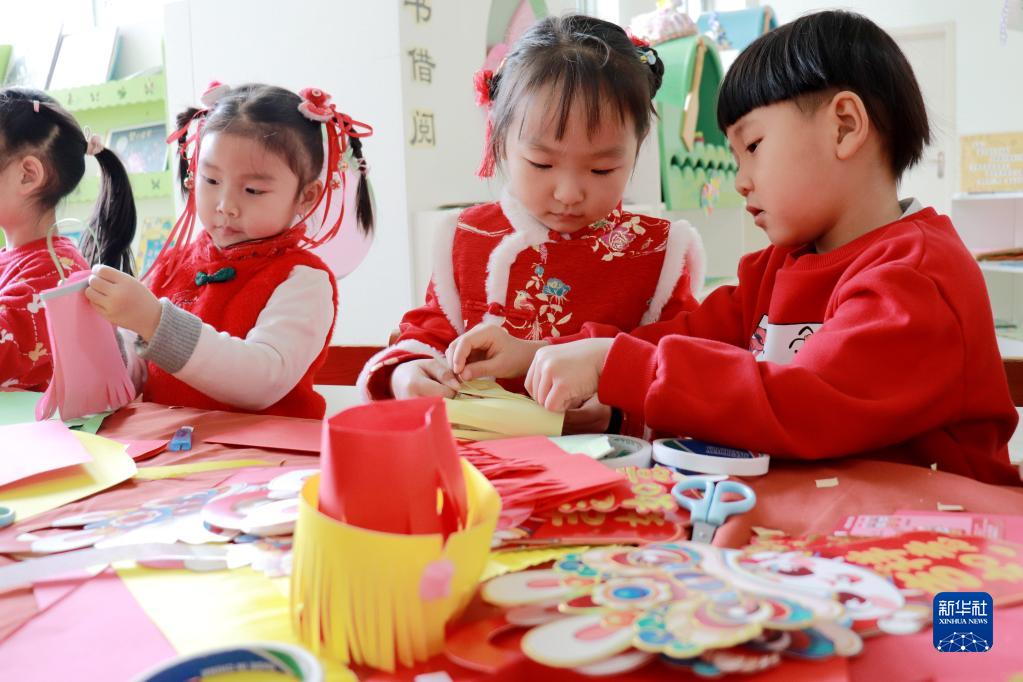 2月3日,山东省青岛西海岸新区滨海新村幼儿园小朋友在制作灯笼。