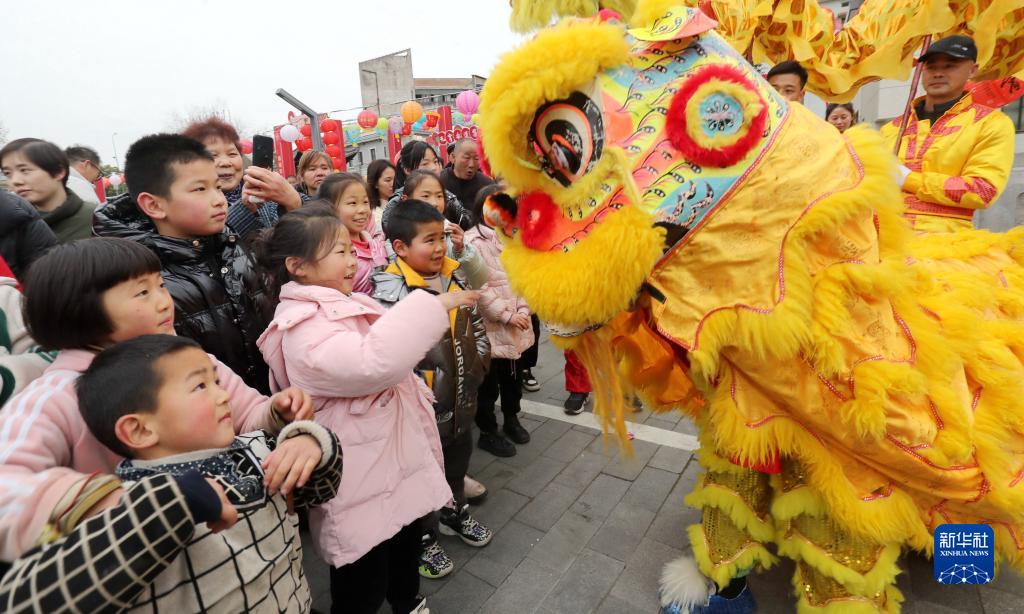 2月2日,在浙江省湖州市德清县阜溪街道三桥社区元宵灯会上,民间艺人在表演舞狮。