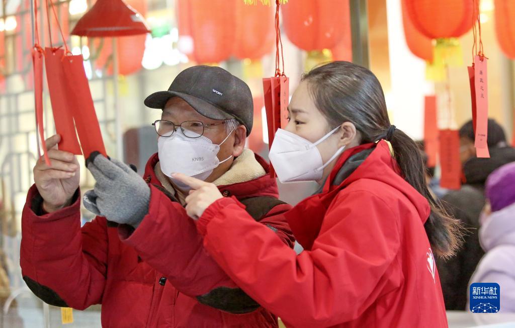 2月3日,在山东省临沂市郯城县郯城街道龙泉社区,社区志愿者(左一)与居民一起猜灯谜。
