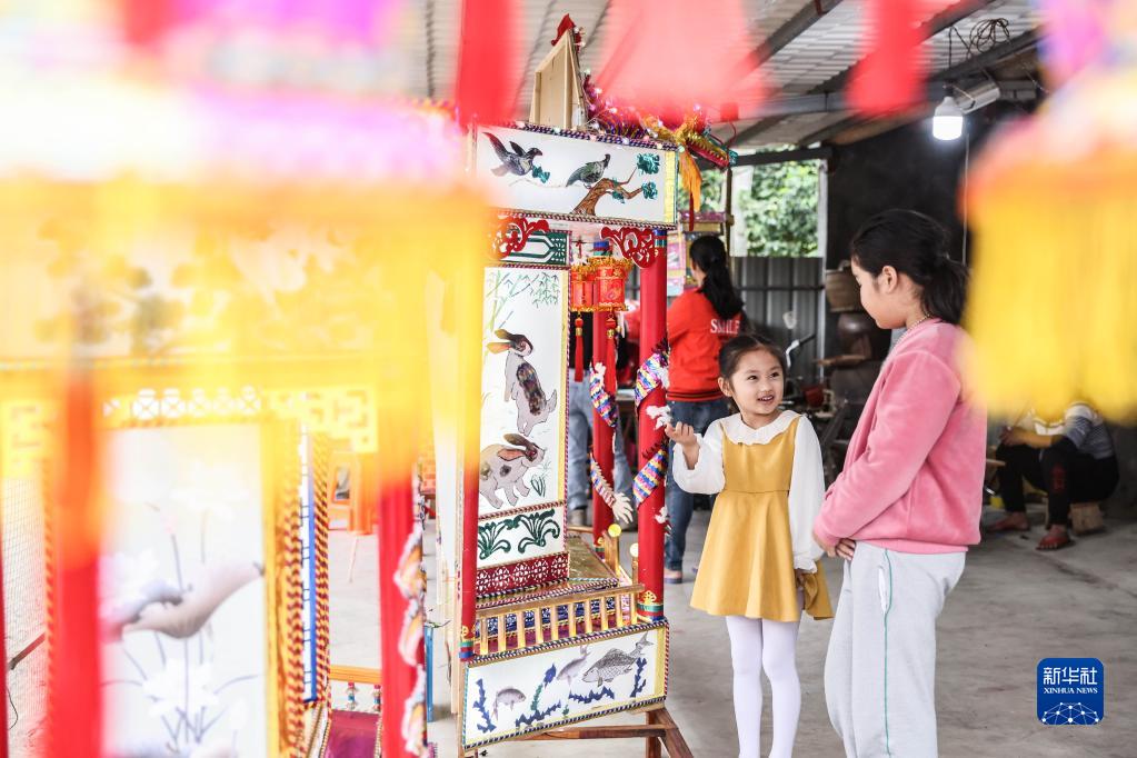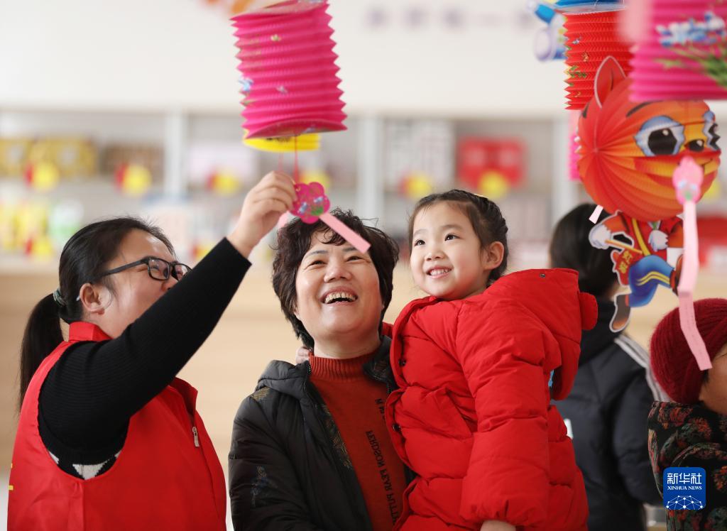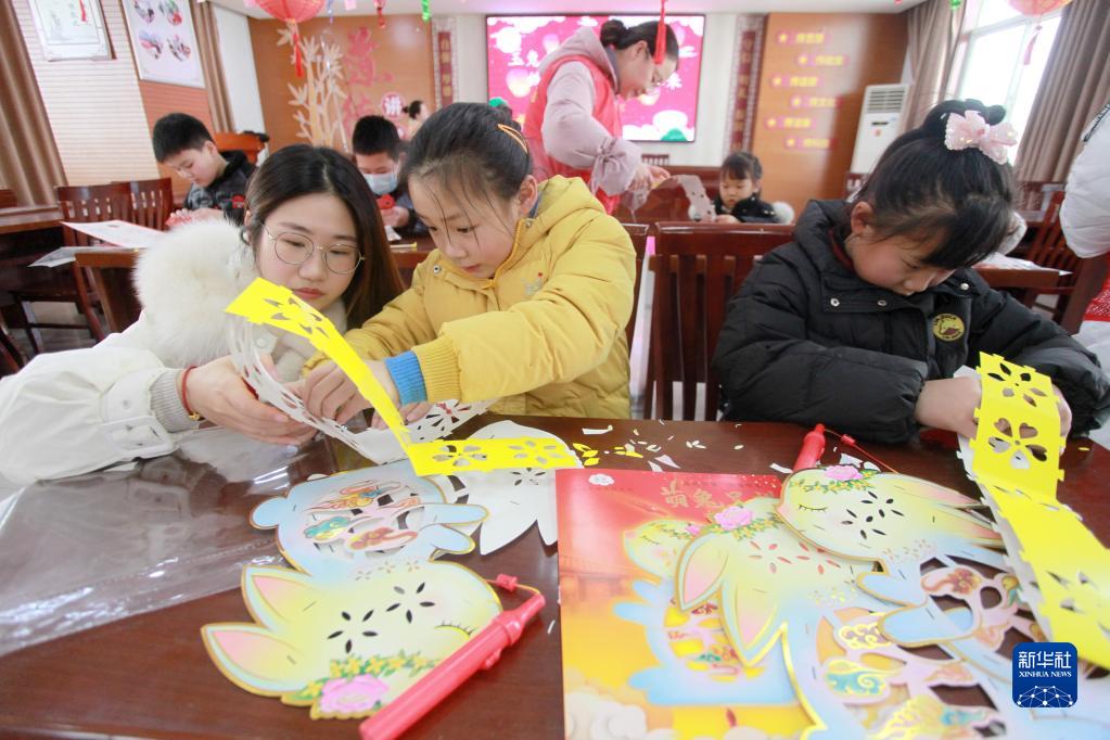 2月3日,在山东省临沂市沂南县湖头镇新时代文明实践所,志愿者和孤困儿童一起制作花灯。