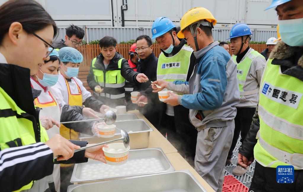 2月3日,在上海杨浦区的中建八局中节能项目工地,项目青年员工与杨浦区大桥街道志愿者为工友们盛汤圆。