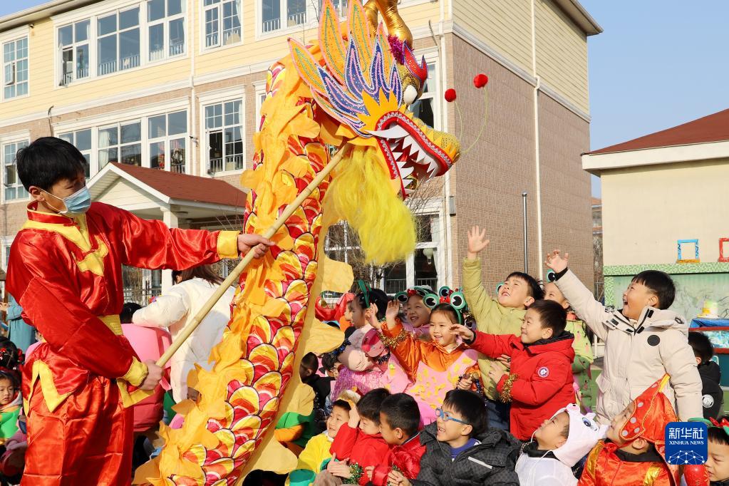 2月3日,山东省青岛西海岸新区第一幼儿园小朋友观看舞龙表演。