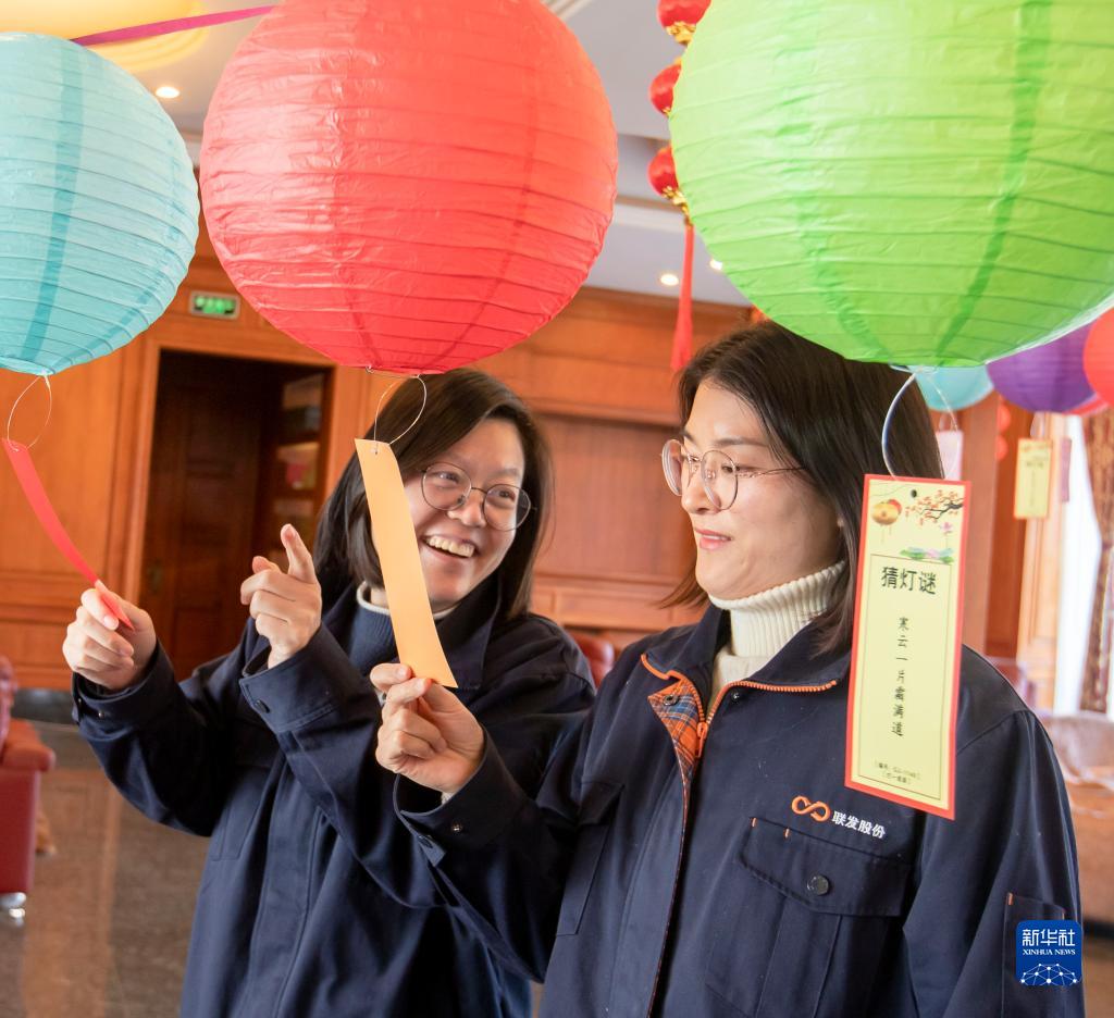 2月3日,江苏省海安经济技术开发区一家公司的员工在进行猜灯谜活动。