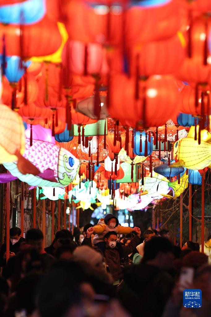 2月2日,游客在南京老门东历史文化街区赏灯游玩。