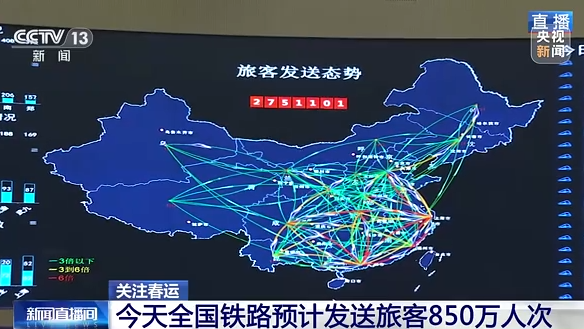 总台央视记者郑连凯:我现在就是在国铁集团运输调度指挥大厅,通过我身后的大屏幕可以实时看到全国15.5万公里铁路线上列车运行状态和重点车站的客流情况。首先给大家通报一组数字,我们从国铁集团拿到最新的数据,今天全国铁路预计发送旅客850万人次,计划开行旅客列车9837列。