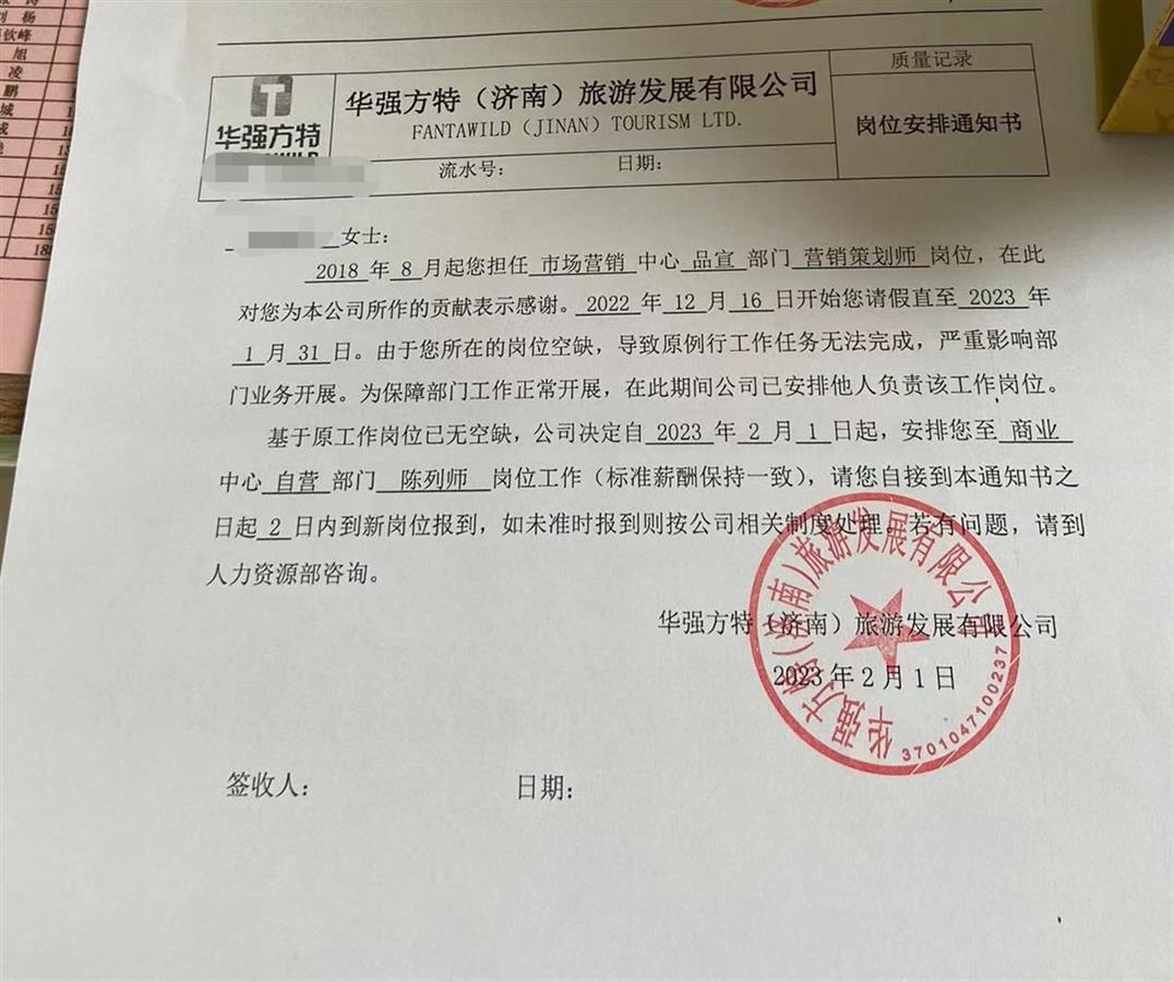 对此,济南方特的官方账号曾发布声明称,员工唐女士的事假共计47天,考虑2022年受疫情影响整体运营压力较小,公司批准其假期。但12月31日突然迎来运营高峰,该岗位宣传至关重要,公司不得已安排他人担负该岗位工作。鉴于原工作岗位无空缺,公司为其安排与原专业匹配度高的陈列师(主要负责门店文化产品陈列及拍摄剪辑宣发,非售卖员),但唐女士拒不接受。