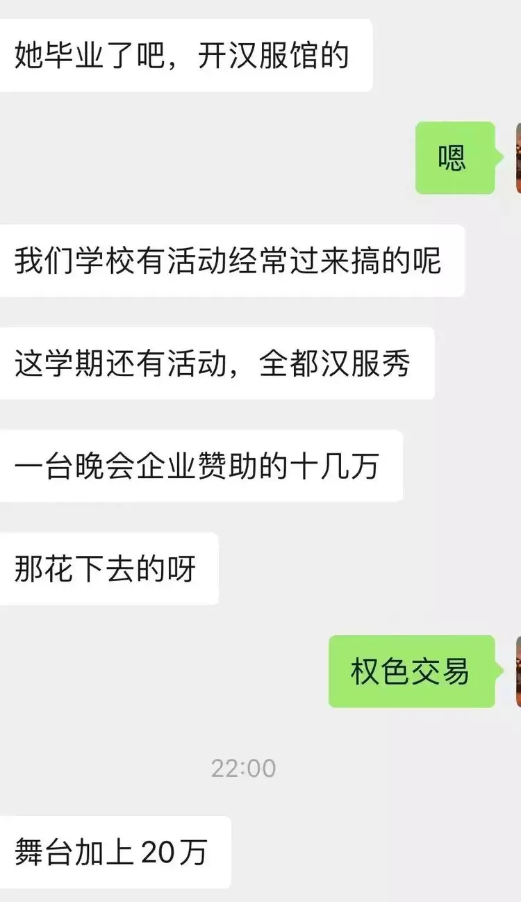 比如一个被曝光的开汉服店的女店主,目前已经毕业,学校里只要组织活动,全都是汉服秀,一场下来,动辄十几万元。