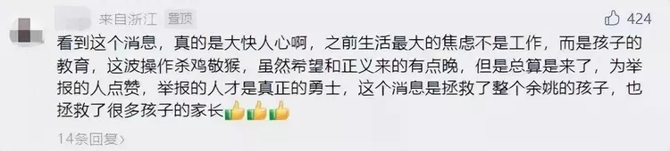 “看到这个消息,真的是大快人心啊,之前生活最大的焦虑不是工作,而是孩子的教育,这波操作杀鸡儆猴,虽然希望和正义来的有点晚,但是总算是来了,为举报的人点赞,举报的人才是真正的勇士,这个消息是拯救了整个余姚的孩子,也拯救了很多孩子的家长。”