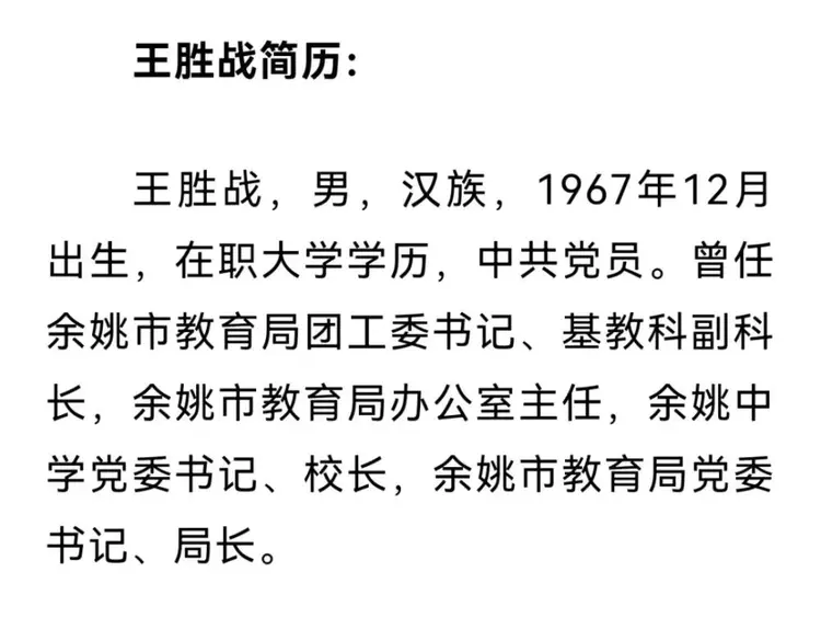 事情缘起本月初,清廉宁波微信公众号发布的一则通报:余姚市教育局党委书记、局长王胜战被查。