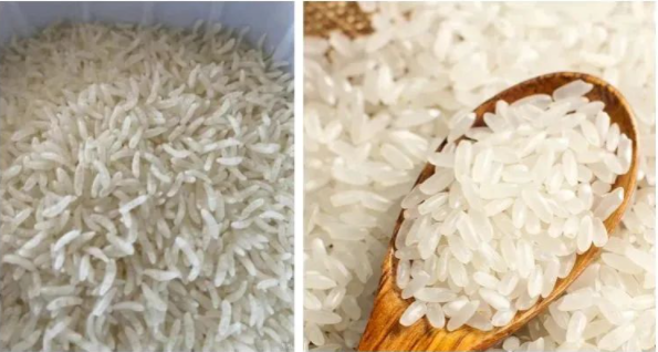 很多自热米饭中的大米(左下图)比较细长略带弧度,大小比较均匀,外形上与普通大米(右下图)不太一样。