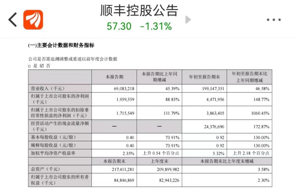 另据Wind数据显示,顺丰控股第三季度营收、净利润均创历史同期新高,第三季度净利环比增速为2018年以来首次转正,且同比增速创下新高。