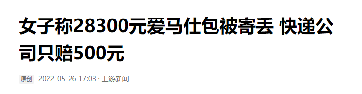 此前顺丰也出现过类似事件。去年5月16日,在广州做网店的李女士通过闲鱼售出的价值28300元的二手爱马仕包,却被顺丰快递寄丢了。事后她找快递公司理论,却得到了只赔偿保价金额500元的回答。