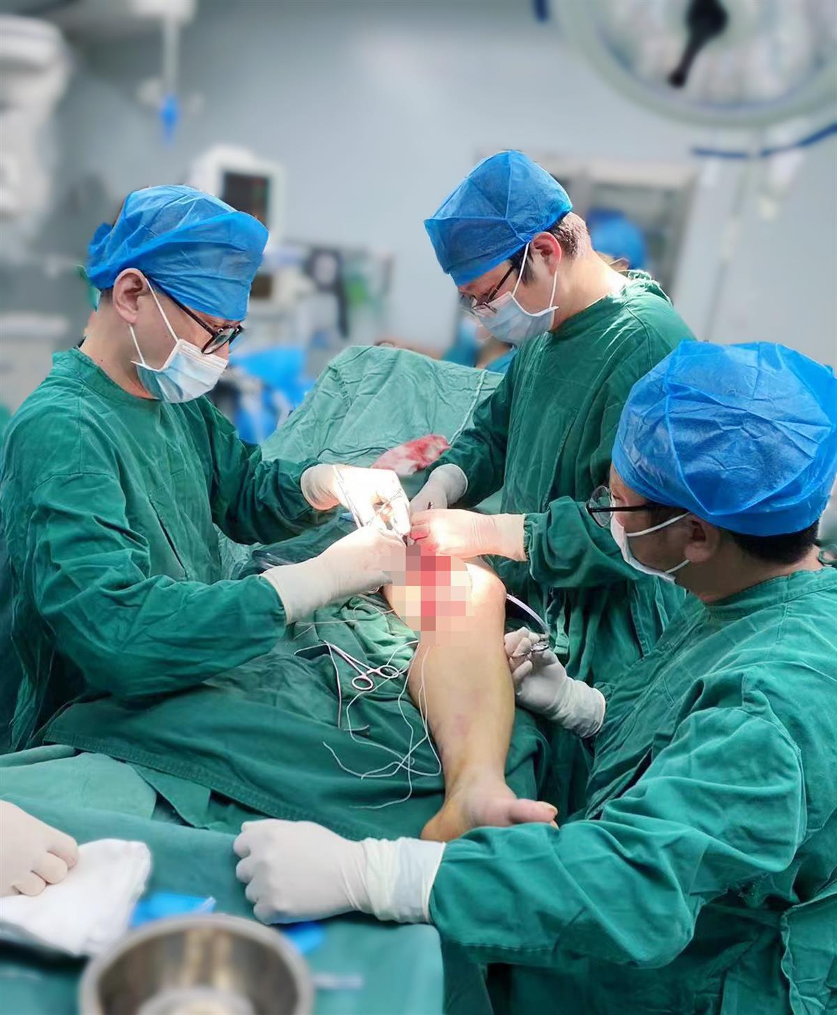 下午2时55分,患者被送入手术室,创伤外科中心医护立即到位,并迅速做好术前准备。麻醉师在超声引导下,精准放置深静脉导管并予以插管全麻,专家团队争分夺秒小心将钢筋从伤者下肢取出,避免造成二次伤害,并迅速行血管吻合术。下午4时50分,手术顺利完成,患者生命体征稳定,被送入骨科病房。