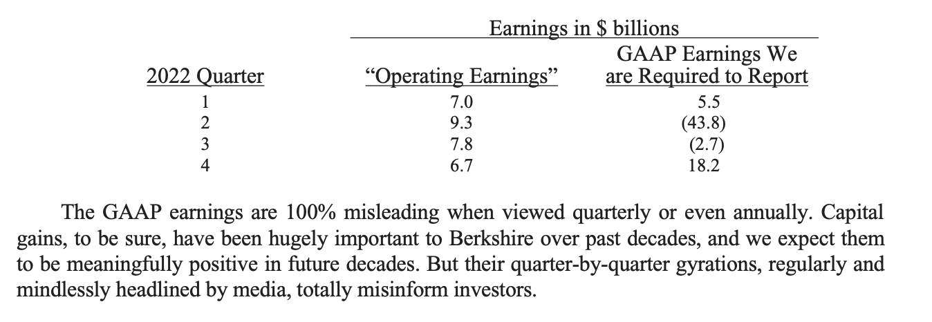 “查理和我专注于这个营业利润,并敦促你也这样做。如果没有我们的调整,GAAP数字在每一个报告日期都会出现疯狂的波动。尤其是在2022年,它的波动是绝不寻常的。”巴菲特写道,“如果按季度甚至按年度来看,GAAP的收益是100%的误导。可以肯定的是,在过去的几十年里,资本收益对伯克希尔来说非常重要,我们预计它们在未来几十年也会产生积极的影响。但是,媒体经常无意识地报道它们的逐季波动,这完全误导了投资者。”