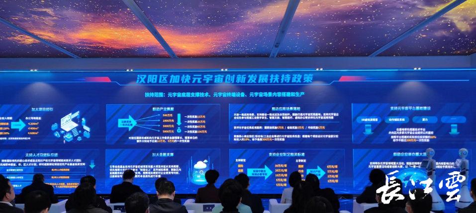 揭牌仪式现场,汉阳区打造的虚拟形象代言人“知小音”发布了《汉阳区关于加快元宇宙创新发展扶持政策》,将从元宇宙底层支撑技术、元宇宙终端设备、元宇宙场景内容搭建和生产三个范围,鼓励产业集聚、加大金融支撑、推动应用场景落地。