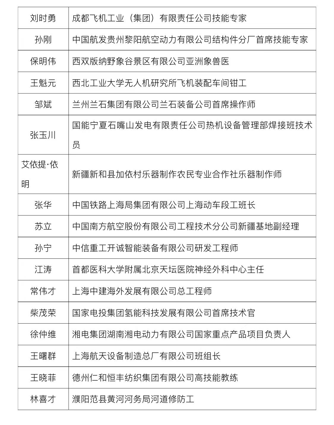 10位“大国工匠年度人物”分别是:航空工业哈尔滨飞机工业集团有限责任公司数控铣工秦世俊,广西汽车集团有限公司钳工郑志明,天津港集团第一港埠有限公司港口内燃装卸机械司机成卫东,中国中铁隧道局集团盾构操作工母永奇,中国航天科技集团有限公司第六研究院西安航天发动机有限公司数控车工何小虎,中国水利水电第四工程局有限公司机电安装分局桥式起重机司机田得梅(女),国网山东省电力公司超高压公司电气试验工冯新岩,中国商飞上海飞机制造有限公司飞机装配工周琦炜,徐工集团徐州重型机械有限公司数控车工孟维,四川广汉三星堆博物馆文物修复师郭汉中。他们都是所在行业的顶尖技术技能人才,都是劳模精神、劳动精神、工匠精神的优秀传承者。