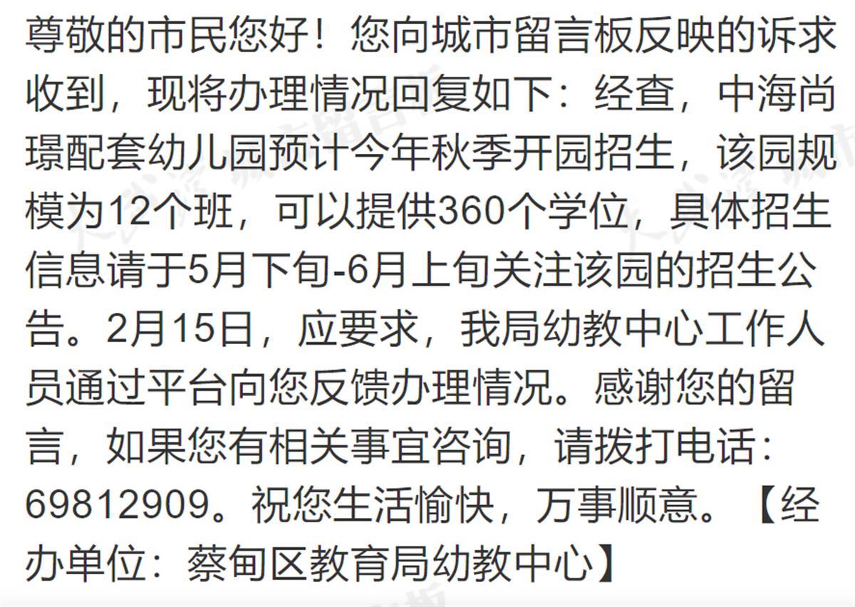 蔡甸区:经查,中海尚璟配套幼儿园预计今年秋季开园招生,该园规模为12个班,可以提供360个学位,具体招生信息请于5月下旬至6月上旬关注该园的招生公告。