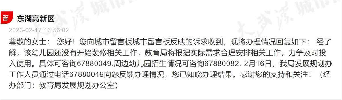 东湖高新区:经了解,该幼儿园还没有开始装修相关工作,教育局将根据实际需求合理安排相关工作,力争及时投入使用。具体可咨询67880049,周边幼儿园招生情况可咨询67880082。