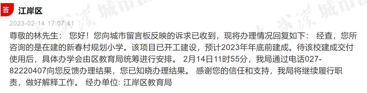 江岸区:经查,您所咨询的是在建的新春村规划小学。该项目已开工建设,预计2023年年底前建成。待该校建成交付使用后,具体办学会由区教育局统筹进行安排。