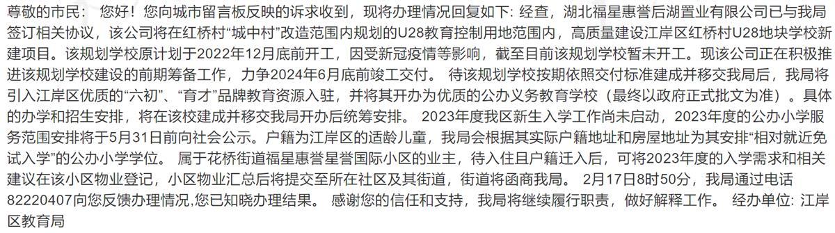 江岸区:经查,湖北福星惠誉后湖置业有限公司已与我局签订相关协议,该公司将在红桥村“城中村”改造范围内规划的U28教育控制用地范围内,高质量建设江岸区红桥村U28地块学校新建项目。该规划学校原计划于2022年12月底前开工,因受新冠疫情等影响,截至目前该规划学校暂未开工。现该公司正在积极推进该规划学校建设的前期筹备工作,力争2024年6月底前竣工交付。待该规划学校按期依照交付标准建成并移交我局后,我局将引入江岸区优质的“六初”“育才”品牌教育资源入驻,并将其开办为优质的公办义务教育学校(最终以政府正式批文为准)。具体的办学和招生安排,将在该校建成并移交我局开办后统筹安排。2023年度我区新生入学工作尚未启动,2023年度的公办小学服务范围安排将于5月31日前向社会公示。户籍为江岸区的适龄儿童,我局会根据其实际户籍地址和房屋地址为其安排“相对就近免试入学”的公办小学学位。属于花桥街道福星惠誉星誉国际小区的业主,待入住且户籍迁入后,可将2023年度的入学需求和相关建议在该小区物业登记,小区物业汇总后将提交至所在社区及其街道,街道将函商我局。