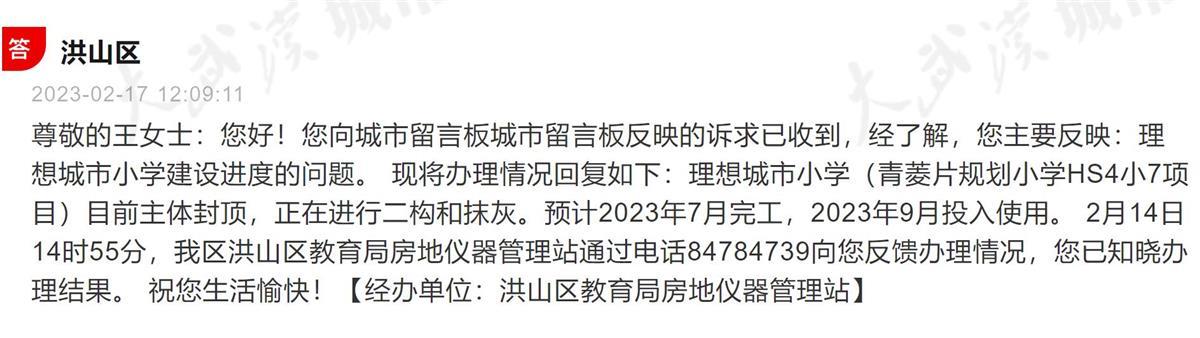 2月28日,极目新闻记者从武汉城市留言板上看到,一些网友对自家附近的新建学校何时招生以及最新进展进行了咨询,相关部门也给出了回复。