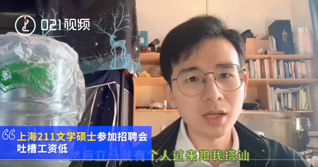 据九派新闻报道,博主“严肃的虾米”是上海大学的文学硕士,参加了在上海举行的多场面对高校毕业生的线下招聘会之后,他没能找到心仪的工作。