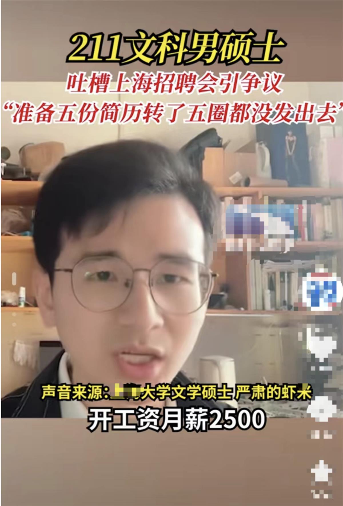 当事人此前发布的视频中,描述自己所参加的招聘会现场挤满了“乌泱泱的人群”。他罗列了一些知名国企和外企的招聘,岗位为服务生、接线员等,工资在2500至5500元不等,他觉得这些工资在上海“不是特别人道”。最后转了五圈,没有找到专业对口的理想工作,一份简历都没有投出去。