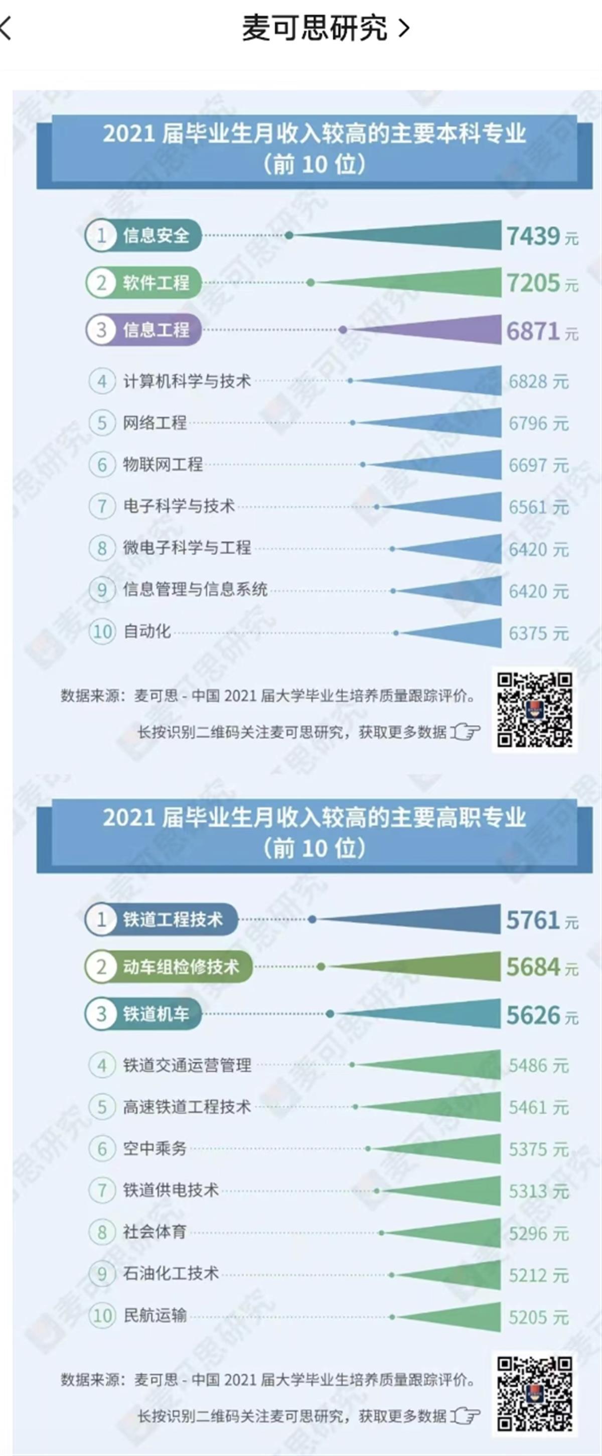 极目新闻记者注意到,麦可思研究院发布的《2022年中国大学生就业报告》提到,2021届毕业生月收入较高的前10个本科专业,涵盖的基本都是如信息安全、软件工程、网络工程等热门理科专业。此外,报告中统计,长三角、珠三角地区就业毕业生薪资较高。应届生在长三角(2021届本科:6484元,高职:4984元)和珠三角地区就业的薪资水平(2021届本科:6431元,高职:4748元)始终保持领先。