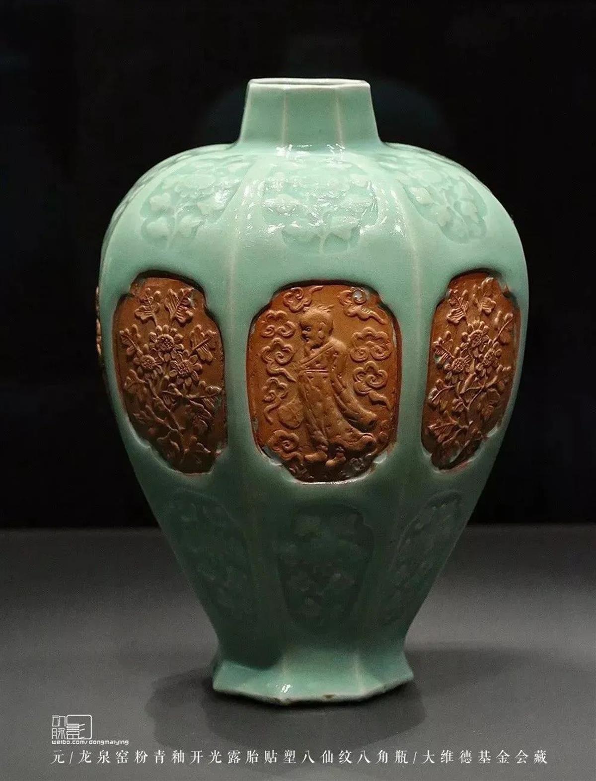 龙泉窑粉青釉开光露胎贴塑八仙纹八角瓶, 现藏于大英博物馆