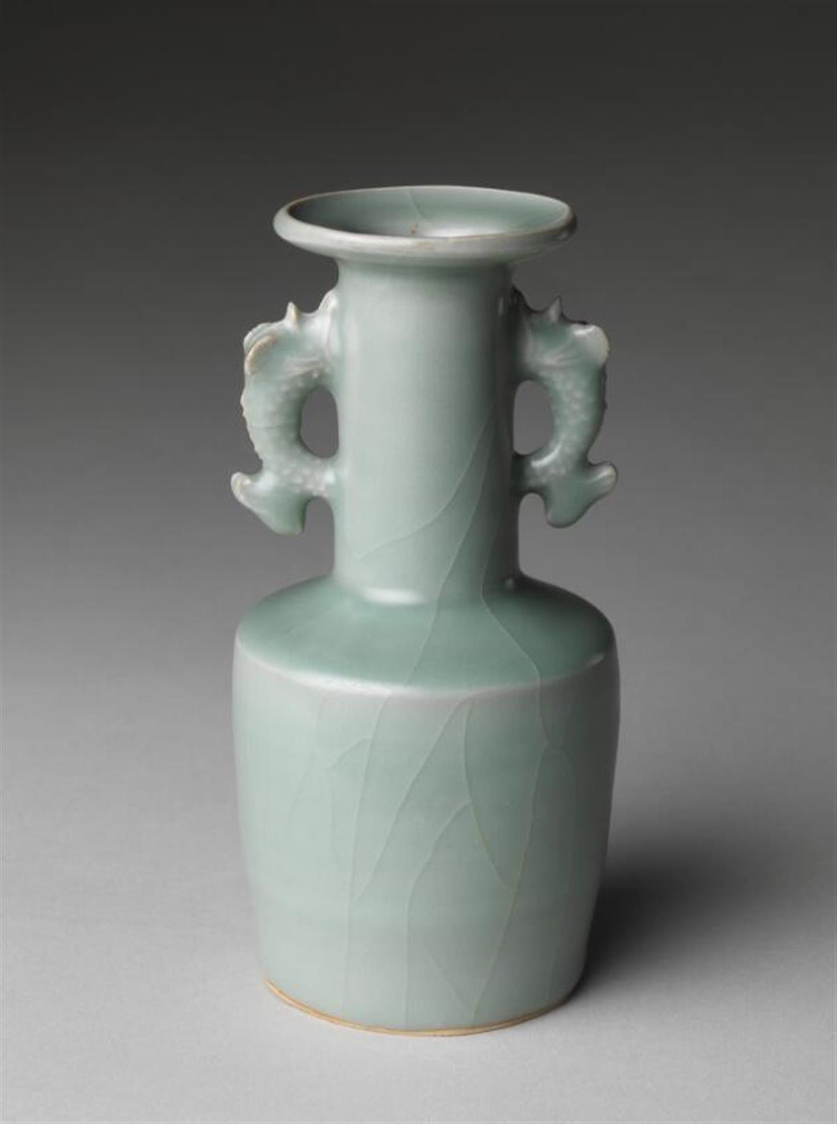 现藏于美国大都会博物馆的龙鱼柄花瓶便是南宋龙泉瓷青釉浮雕瓷的代表作品。这尊高17.1厘米的花瓶,柄为两尾灵动的游鱼。花瓶身呈现出极为明显的光亮感,釉质莹亮堪比翡翠;同时,在瓶身加上一对“耳朵”、创新出“鱼龙柄”“凤耳”“贯耳”等,也是此时龙泉青瓷的创新。
