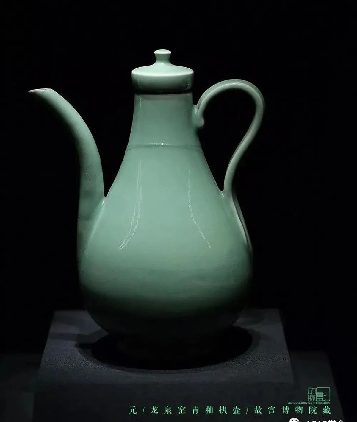现藏于故宫博物院的元代龙泉窑青釉执壶还保留着“前辈”们的样子,它上瘦下丰,线条流畅,收放适度,造型优美,此时还能看出壶身釉面匀净、釉色粉青、美若天然古玉的惊艳样貌。