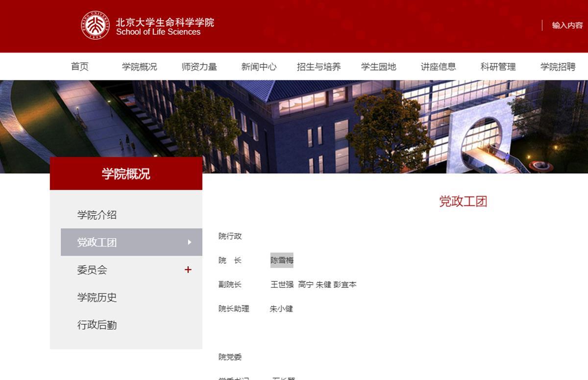 陈雪梅担任北京大学生命科学学院院长(北京大学生命科学学院官网截图)
