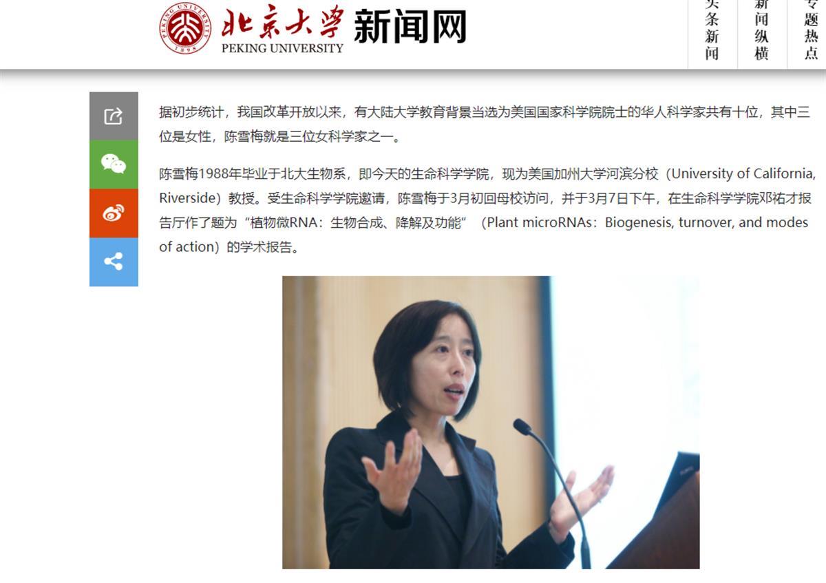 据北京大学生命科学学院官网资料显示,美国国家科学院院士、加州大学河滨分校特聘教授陈雪梅已全职回国,担任北京大学生命科学学院院长。