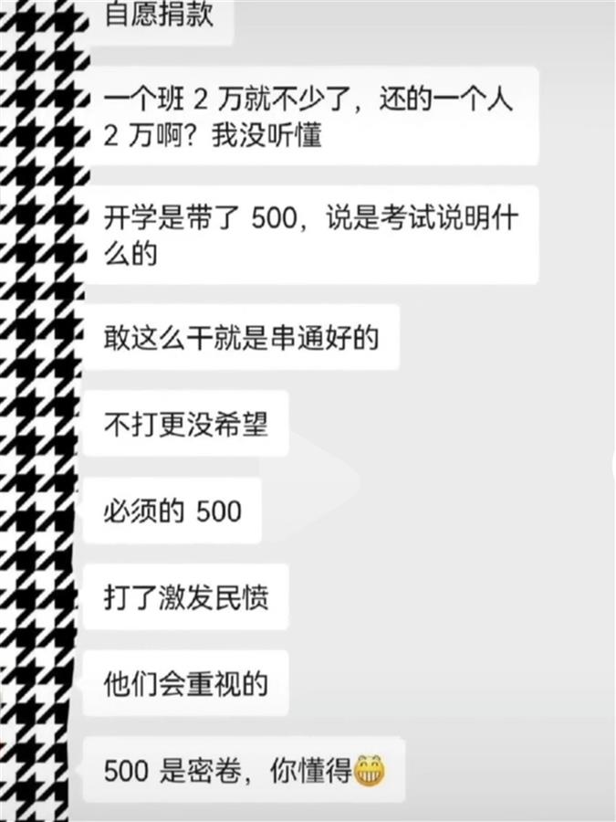有网络聊天截图显示,在桃城中学近日召开的家长会上,老师要求每个孩子拿出2万元,进行慈善捐款。截图中有人称,老师并没有说自愿捐款,但是捐款的人会获得相关的证书。