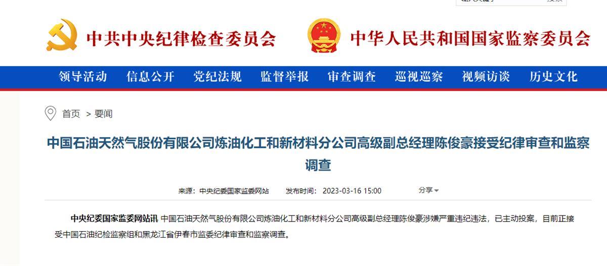 3月16日,中央纪委国家监委网站发布消息,中国石油天然气股份有限公司炼油化工和新材料分公司高级副总经理陈俊豪涉嫌严重违纪违法,已主动投案,目前正接受中国石油纪检监察组和黑龙江省伊春市监委纪律审查和监察调查。