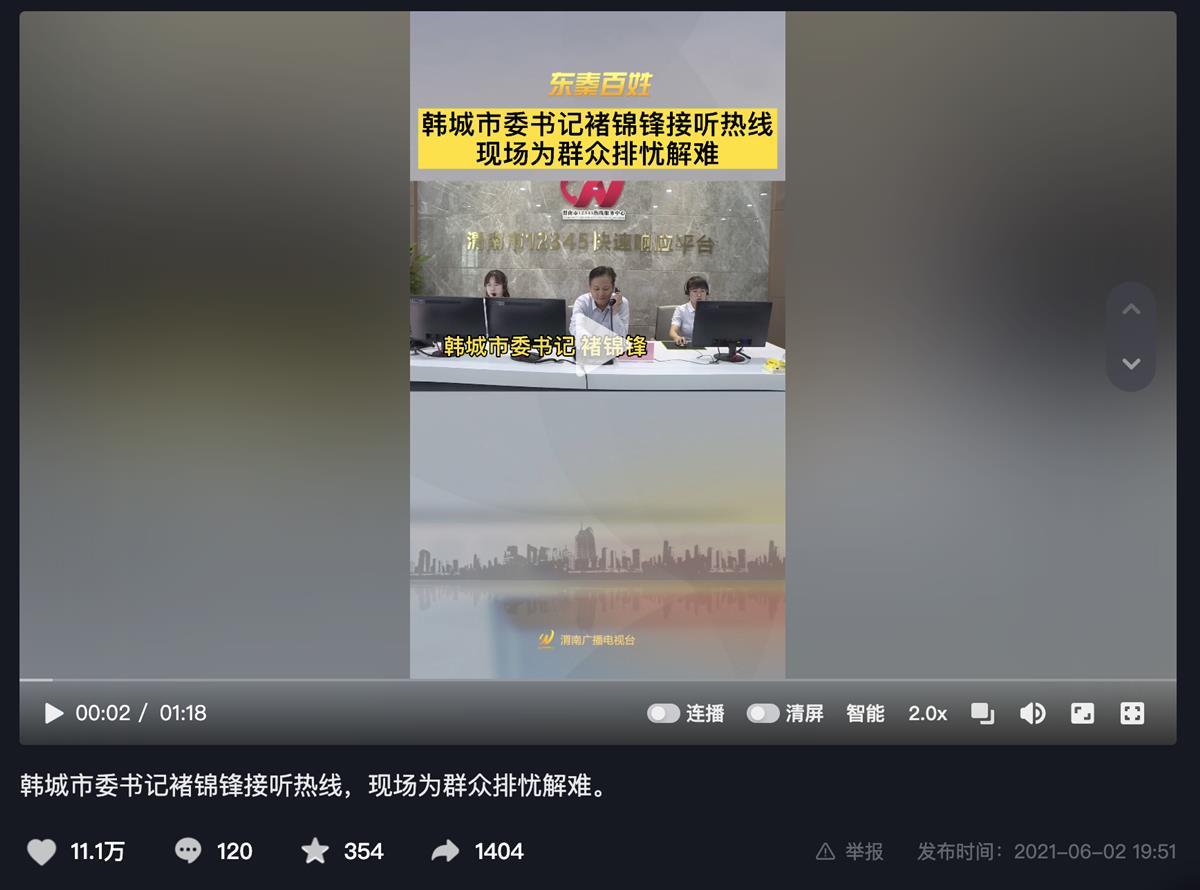 褚锦锋任韩城市委书记时,曾因2021年6月发布的一条视频,获得11万网友点赞。