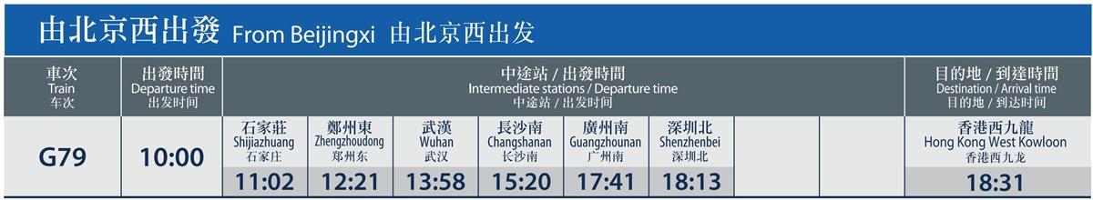 G79次10:00从北京西站出发,13:58经停武汉站,18:31抵达香港西九龙站。