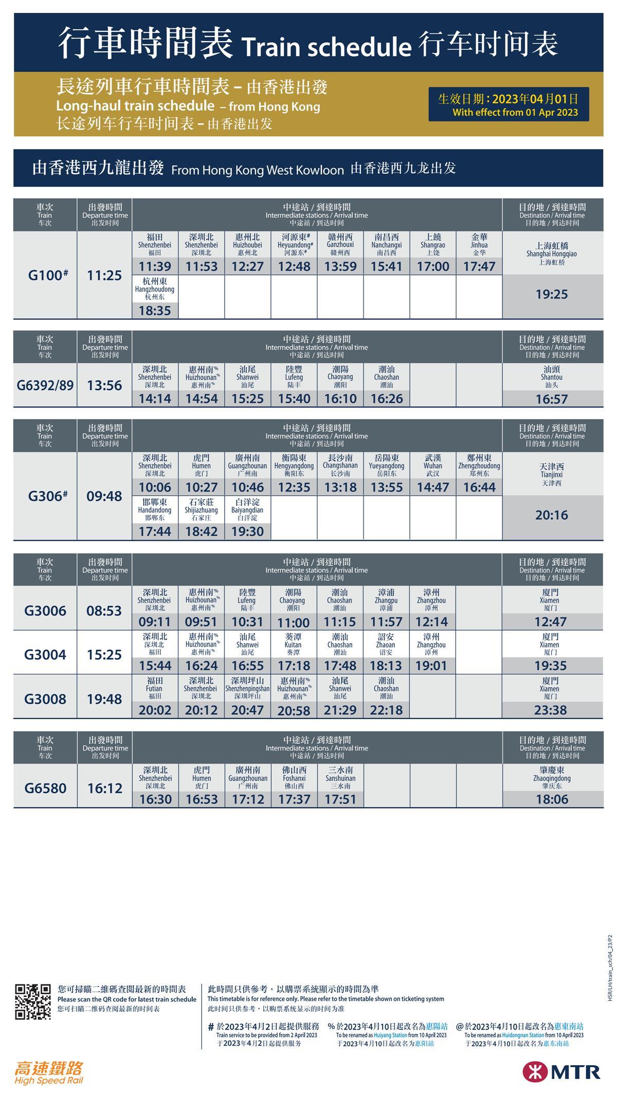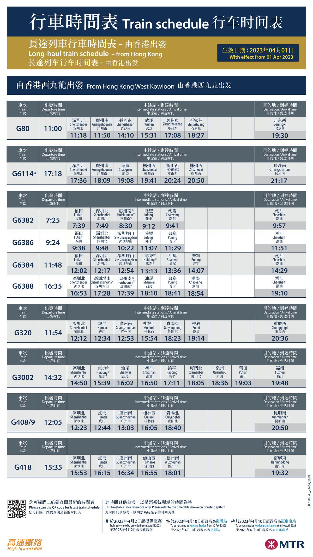 由广州南站出发到香港西九龙站的G6503及G6505次,由昆明南站出发到香港西九龙站的G410/07次。