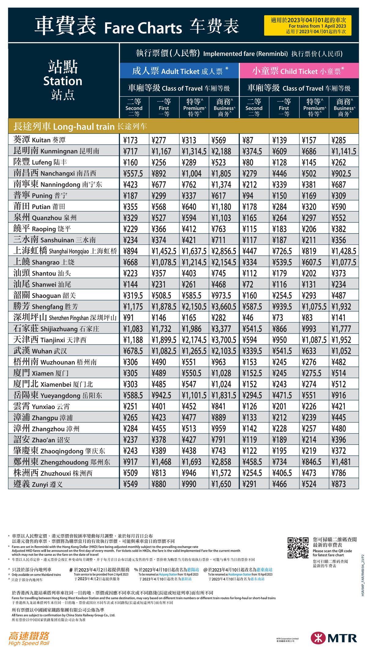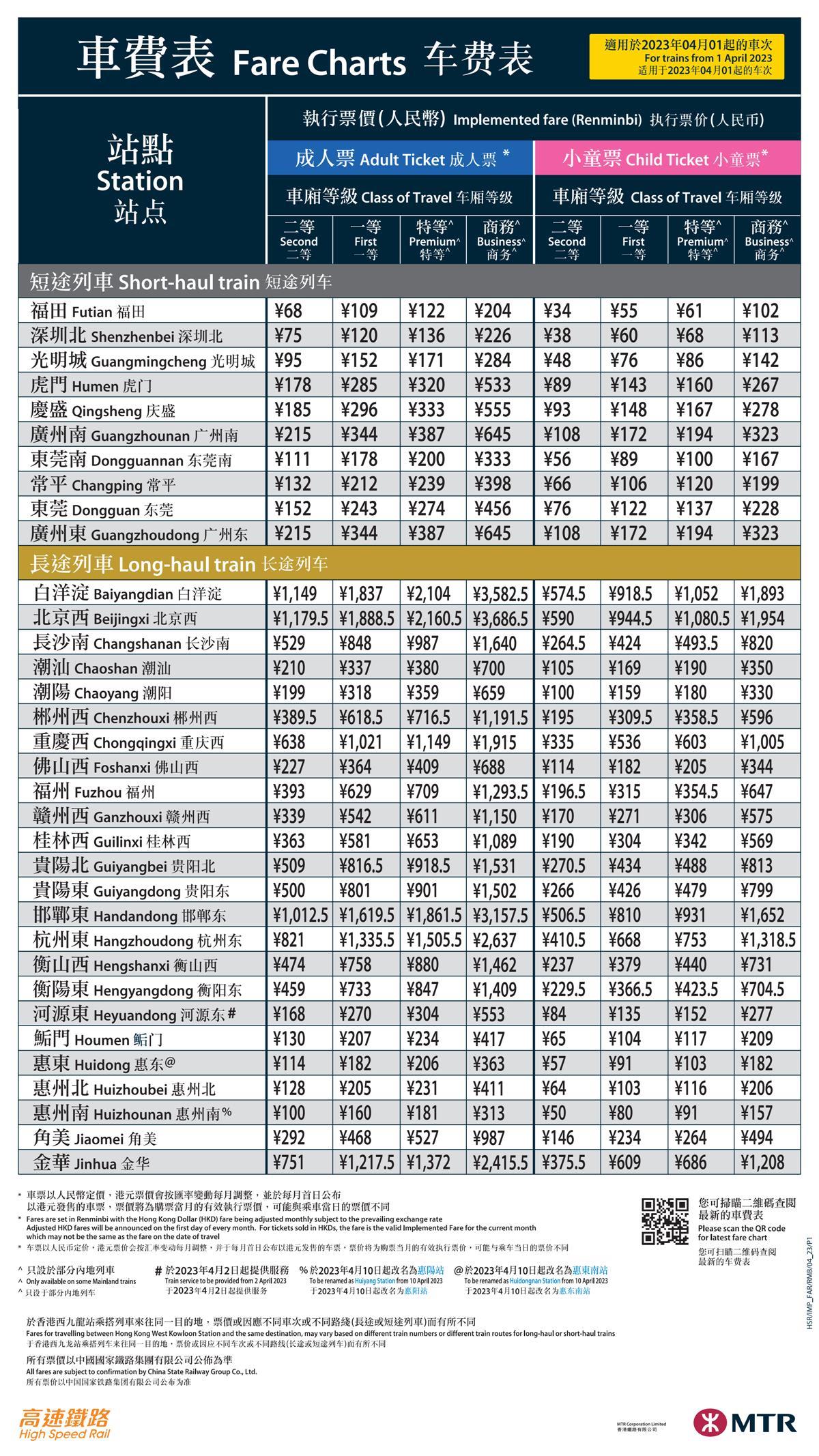 香港高铁票价表