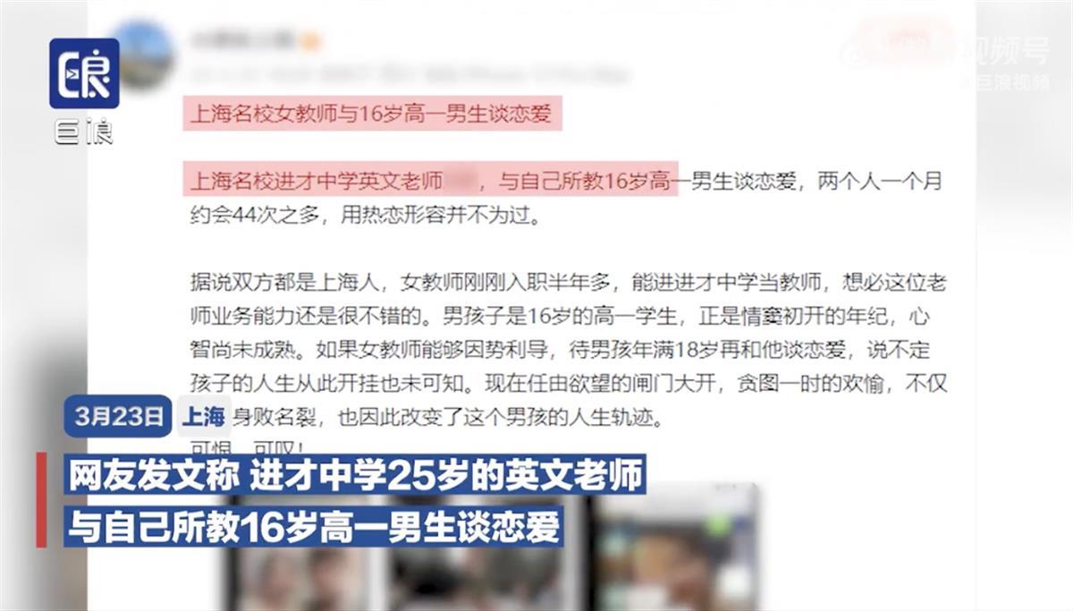 网传内容显示,上海名校进才中学英语老师与自己所教16岁高一男生谈恋爱,两个人一个月约会44次之多,用热恋形容并不为过。据说双方都是上海人,25岁的女教师刚入职半年多,男孩子是16岁的高一学生,正是情窦初开的年纪,心智尚未成熟……