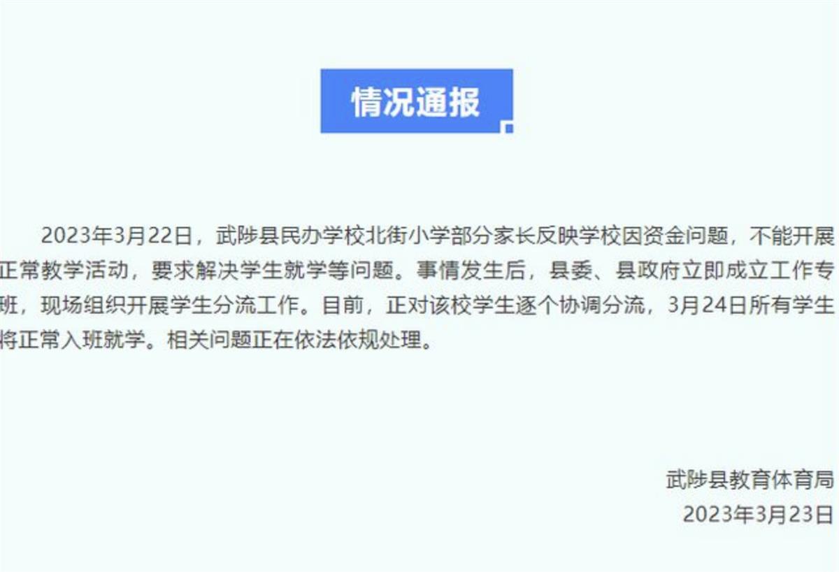 武陟县教育体育局的通报称,2023年3月22日,武陟县民办学校北街小学部分家长反映学校因资金问题,不能开展正常教学活动,要求解决学生就学等问题。事情发生后,县委、县政府立即成立工作专班,现场组织开展学生分流工作。目前,正对该校学生逐个协调分流,3月24日所有学生将正常入班就学。相关问题正在依法依规处理。