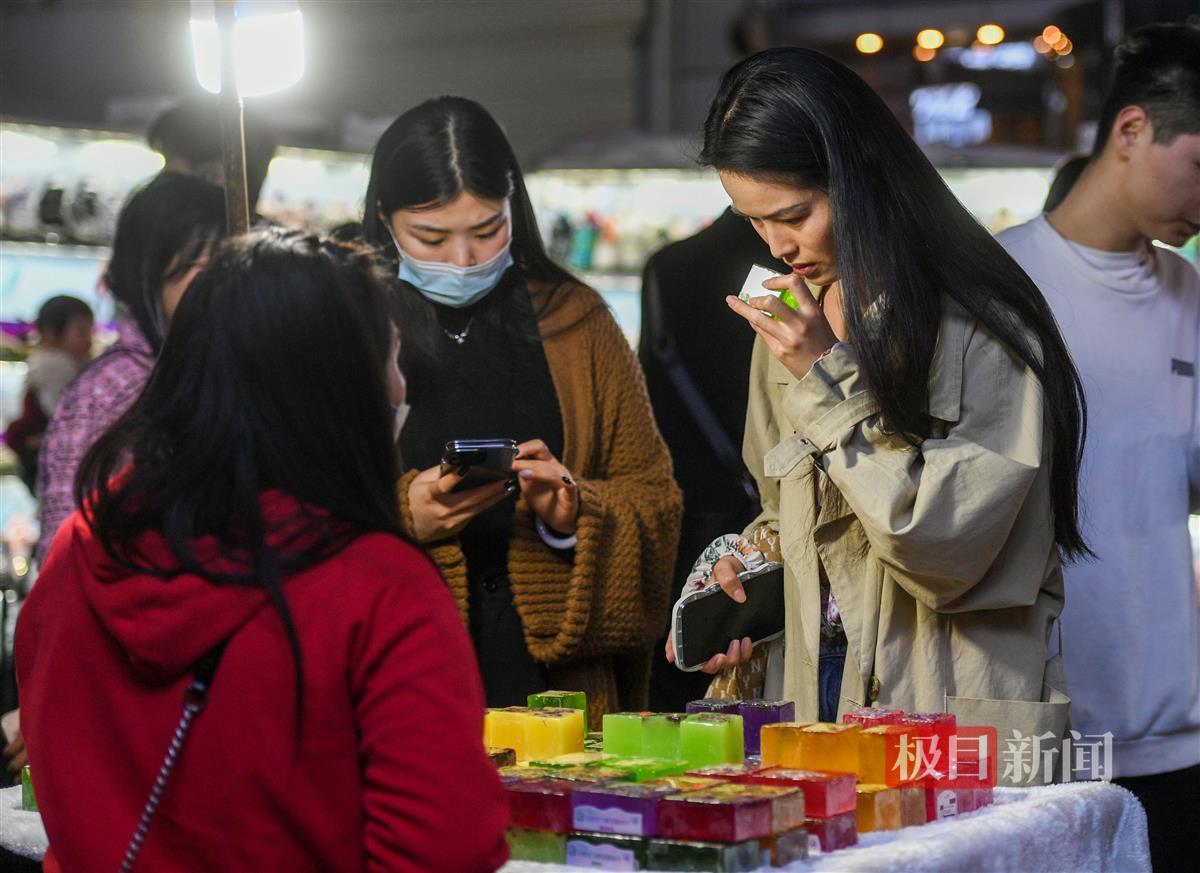 工作一天后,逛逛夜市,做个美睫美甲,让自己拥有美好的心情,“来夜市感受人气,和美甲小姐姐聊聊天,烦恼就烟消云散了。”江女士选择逛夜市来缓释自己的工作压力。
