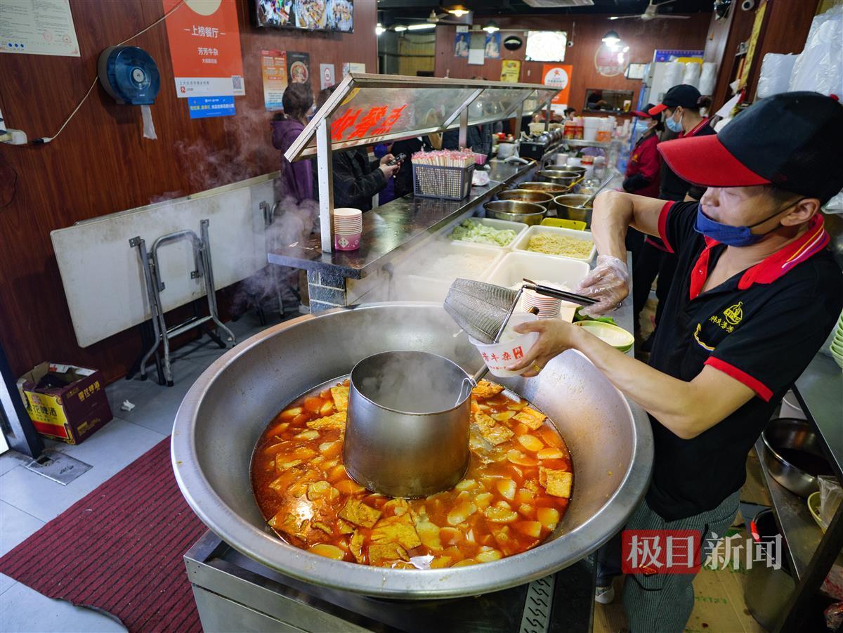 市民李女士正带着老家亲戚来品尝武汉美食,热情介绍道:“牛杂、水饺、糯米包油条、糊米粉、炒面炒米粉,这些武汉特色美食在这里全都有,可以‘一网打尽’。”