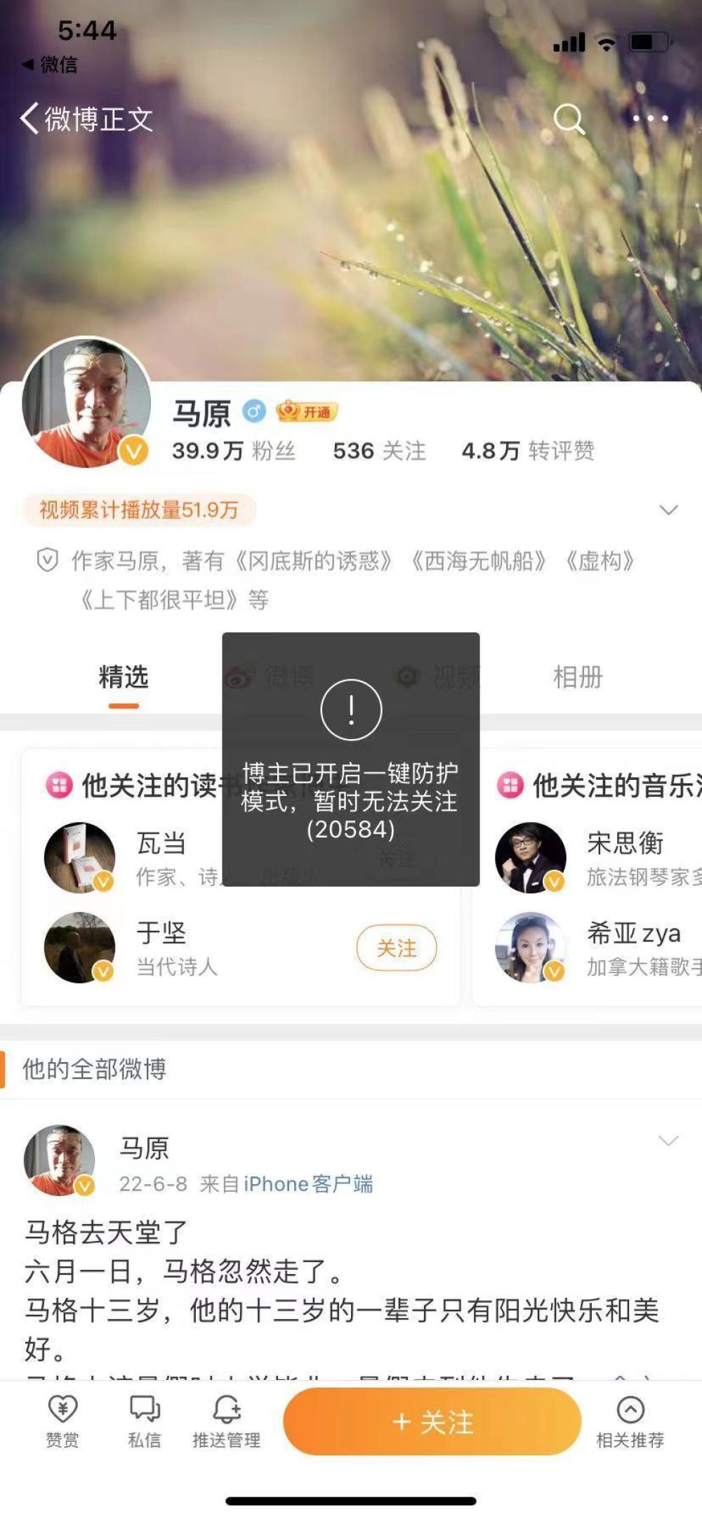马原的微博账号已开启“一键防护”模式,新粉丝无法关注