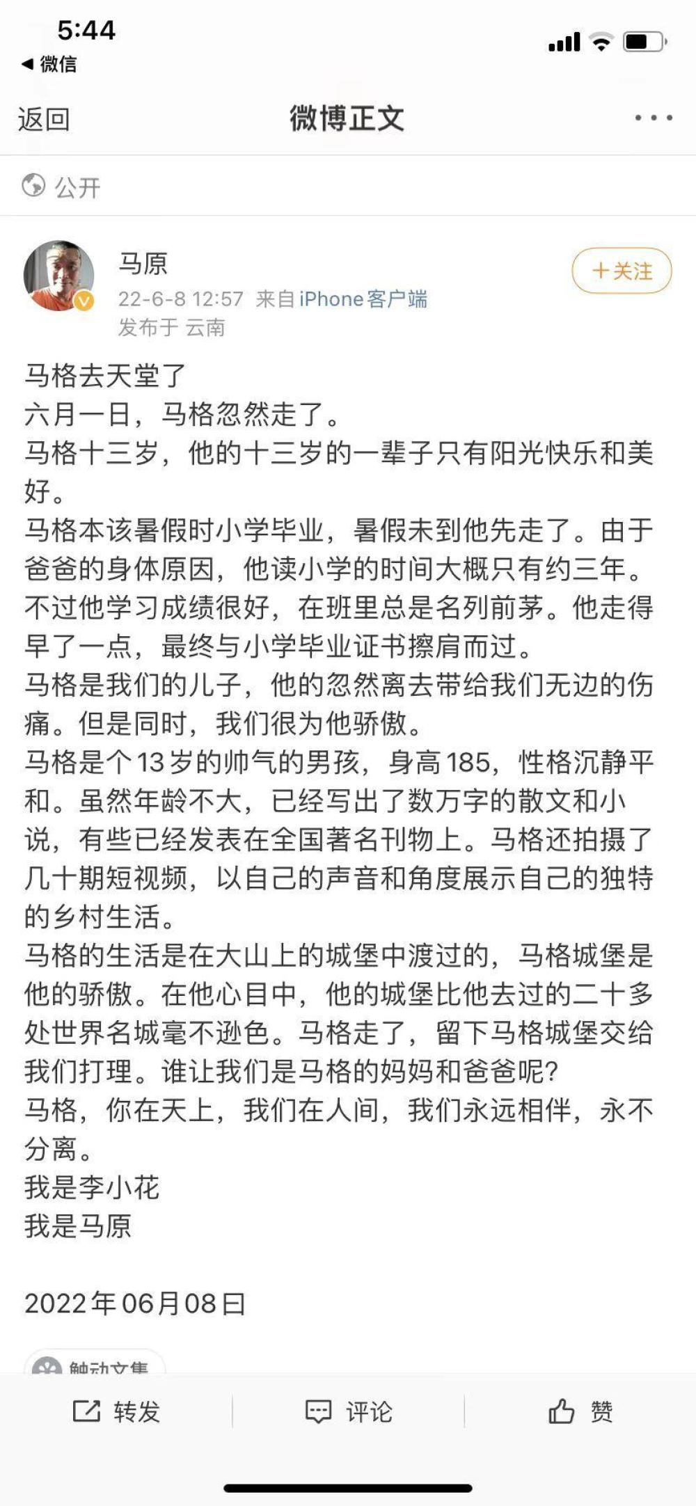 马原于2022年6月8日发布的微博,确认马格已于2022年6月1日离世