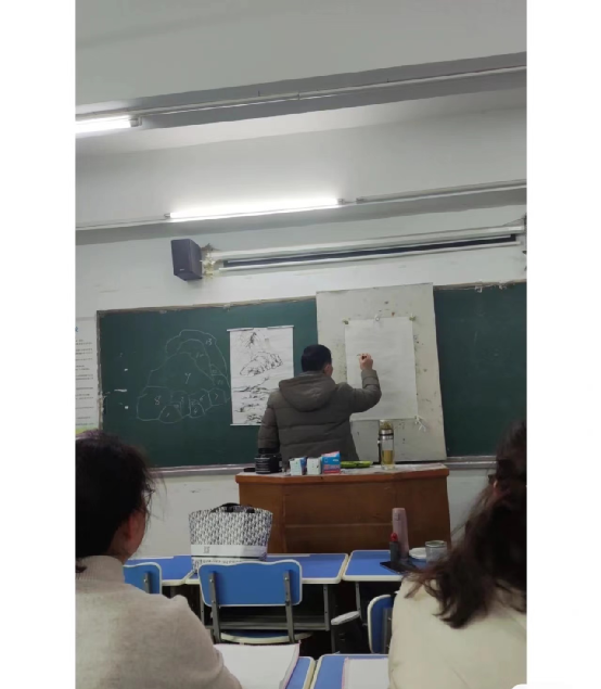 “老师在上面讲课的时候会在黑板上作画,叔叔阿姨们听得很认真,讲完之后会下堂巡视大家画得怎么样,给同学们逐个改画。”