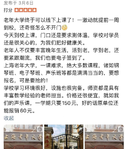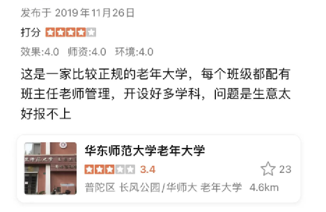 不出所料,几家老年大学不仅拒绝年轻人到老年大学上课,还表示现在班级早已满员,即使是符合规定的老年人也未必报得上课。这也符合某点评网站上网友们对各个老年大学的评价。