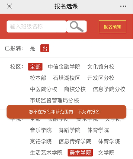 对于老年大学的奇遇,记者也跃跃欲试,于是通过手机申请了淮安老年大学的报名账号,申请账号需要身份证和手机等实名认证,但在报名选课阶段,记者因年龄不够被“识破”,显示不在报名年龄之内,不允许报名。