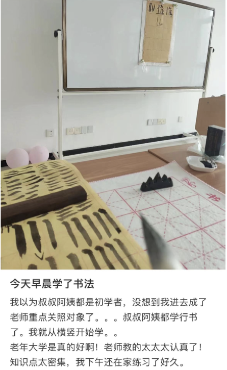 如今她已经上了另一节书法课程,并成为了老师的重点关照对象,其他叔叔阿姨已经学行书了,她还刚从横竖开始学。被特殊照顾的她在小红书感叹老年大学的老师真的太认真了。
