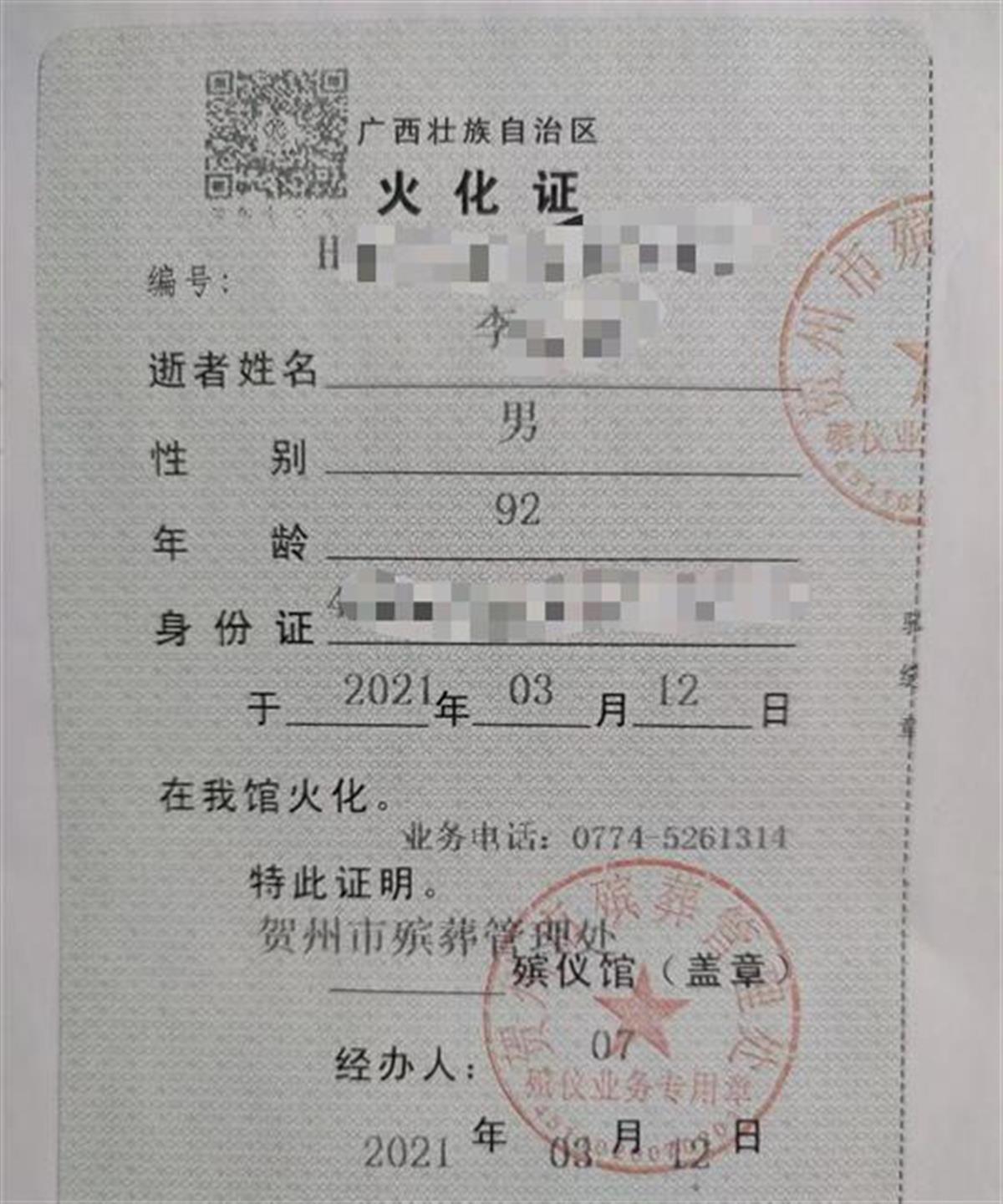 父亲李某远的火化证明 (受访者供图)